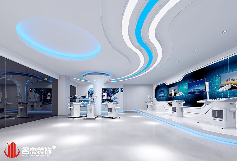 本辦公室裝修設(shè)計(jì)案例是辦公和展廳結(jié)合的美容公司。展廳部分設(shè)計(jì)師以三個(gè)圓形作為中心要素,和大量的弧線來相映襯,使得整個(gè)展廳充滿了時(shí)尚的氣息。而另一部分的展廳則使用藍(lán)色作為點(diǎn)綴的顏色,和整體的辦公功能區(qū)區(qū)分開,再以一定走向的弧線與整個(gè)空間的風(fēng)格互相呼應(yīng),充滿線條美的美學(xué)。