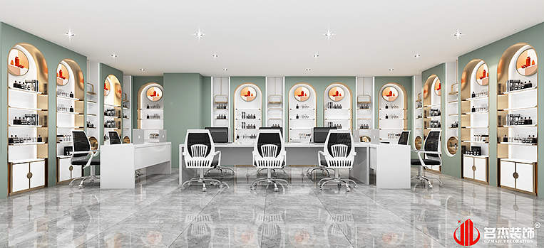 這次美業(yè)紋飾案例中使用的是時下流行的潮流元素,結合該行業(yè)是接觸時尚前端的行業(yè),也是一個能夠突出美的行業(yè),對此設計團隊使用莫蘭迪色系來作為展廳空間的主色調,強調時尚元素的同時,還能夠讓空間增加更多的設計感。利用吊飾吊燈來作為空間的點睛之筆,空間感強烈的同時,還能夠讓空間的層次感更加突出。