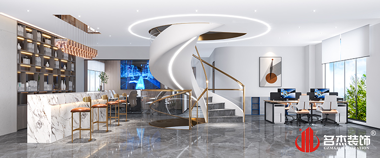 考慮到企業(yè)是以銷售為主,簡約的風格是可以讓辦公室裝修設計空間看起來更加干練,同時沒有過多的裝飾,讓空間變得更加有效率。在展廳區(qū)域采用科技感強烈的元素,讓空間充滿未來感。而在休閑區(qū)則是使用簡約而不簡單的元素,加上燈帶的烘托下,舒適休閑的感覺油然而生,可以讓員工緊張的情緒得到放松。