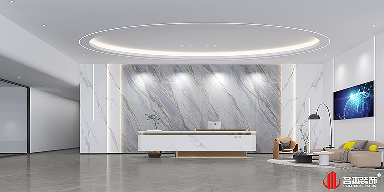 前廳是整個(gè)辦公裝修設(shè)計(jì)空間的一大亮點(diǎn),前臺(tái)背景墻大理石條紋的拼接組合打破了原本傳統(tǒng)的設(shè)計(jì),大理石紋路與燈飾的配合,碰撞出了不一樣的火花,加上嵌入燈帶的配合,使整個(gè)空間充滿靈動(dòng)。圓形吊頂也能夠讓空間煥發(fā)出不一樣的設(shè)計(jì)層次感,兩者相互配合,共同打造出一個(gè)特別的辦公場景。