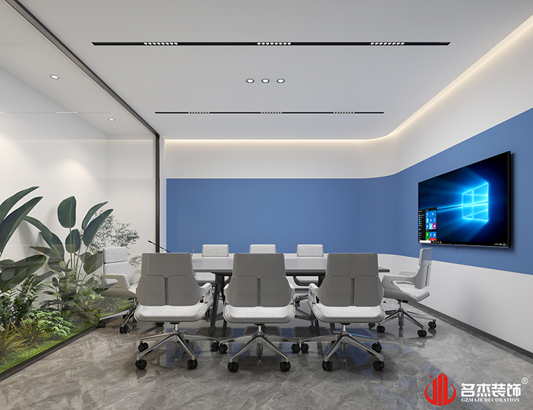 整體使用時尚簡約的風(fēng)格,讓辦公空間看起來更加簡潔,同時在不同區(qū)域使用藍(lán)色作為點(diǎn)綴色,給空間增添了幾分科技感的同時,也讓空間變得不那么單調(diào)。前臺區(qū)域使用圓弧造型的吊頂,搭配弧線形的背景墻,形成一種呼應(yīng)的同時,還能夠增加前臺空間的層次感。在辦公區(qū)域使用藍(lán)色噴漆,區(qū)別于傳統(tǒng)的黑白灰,讓空間更加具有辨識度。