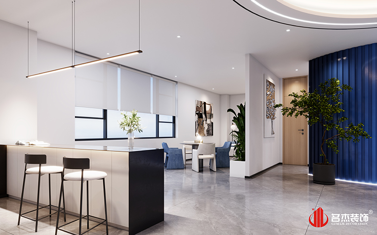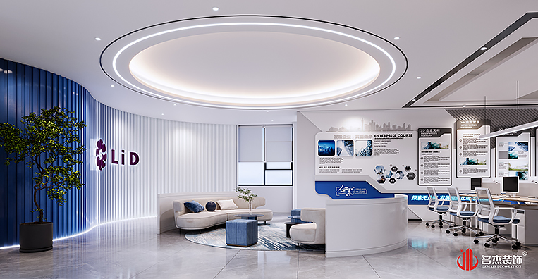 整個(gè)辦公裝修設(shè)計(jì)空間是以時(shí)尚簡(jiǎn)約的風(fēng)格來(lái)作為主打風(fēng)格的,加入企業(yè)LOGO色——藍(lán)色,作為貫穿整個(gè)辦公裝修設(shè)計(jì)空間的點(diǎn)綴色。前廳的背景墻使用的是一種漸變的手法,讓辦公裝修設(shè)計(jì)空間變得更有設(shè)計(jì)感,同時(shí)在前廳的吊頂使用圓弧的元素,讓辦公裝修設(shè)計(jì)空間變得更加有層次感。