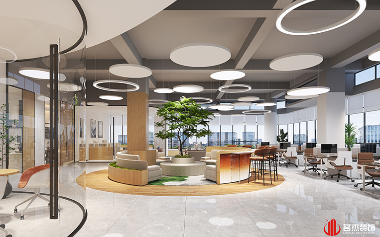 整體風(fēng)格是按照時尚簡約風(fēng)格來設(shè)計的,但是在這里面加入了原木的一些元素,讓整個空間有著清新自然的氛圍,同時圓弧動線的加入也讓空間的整體觀感得到一個很大的提升。特別是在休閑區(qū)這一個區(qū)域,能夠很好的將休閑的元素發(fā)揮出來,在這個空間中顯得尤為突出。在天花區(qū)域,設(shè)計團隊采用的是工業(yè)風(fēng)來打造,但在這個空間加入圓形吊燈和圓形的裝飾物,讓天花區(qū)域看起來更加有特色。#廣州辦公室裝修設(shè)計#