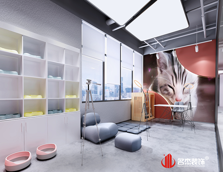 此案例是一家寵物用品店,設(shè)計師按照客戶的要求再結(jié)合該行業(yè)的特點,使用了略帶工業(yè)風(fēng)格的來做為主基調(diào),利用暖色調(diào)的家具和燈光來調(diào)節(jié)工業(yè)風(fēng)中的冷。直播間背景墻直接使用了貓咪圖做背景圖,使用兩個圓弧來進行裝飾。