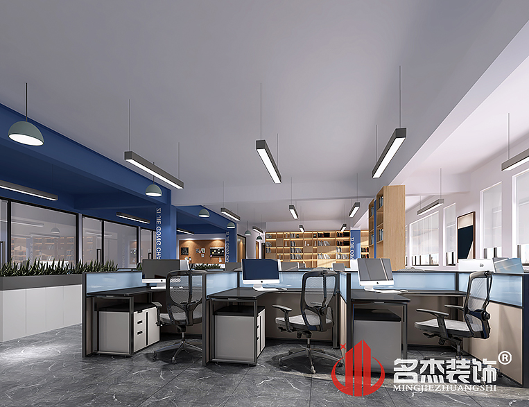 整體的辦公區(qū)域加入了藍(lán)色色調(diào)作為跳色的設(shè)計(jì)元素,也與企業(yè)LOGO的顏色相互呼應(yīng)。部分區(qū)域也采用了弧形元素來(lái)增加整體的設(shè)計(jì)感,讓整個(gè)辦公室裝修設(shè)計(jì)更加具有時(shí)尚感。