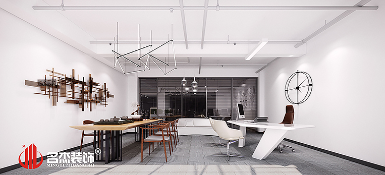 本案例在前臺使用藍色和白色結(jié)合的,將企業(yè)LOGO的顏色和整體的辦公室裝修設(shè)計融為一體,同時也在不同的區(qū)域使用了大量的燈光,必要的地方使用上自然光,讓整個空間更加明亮。